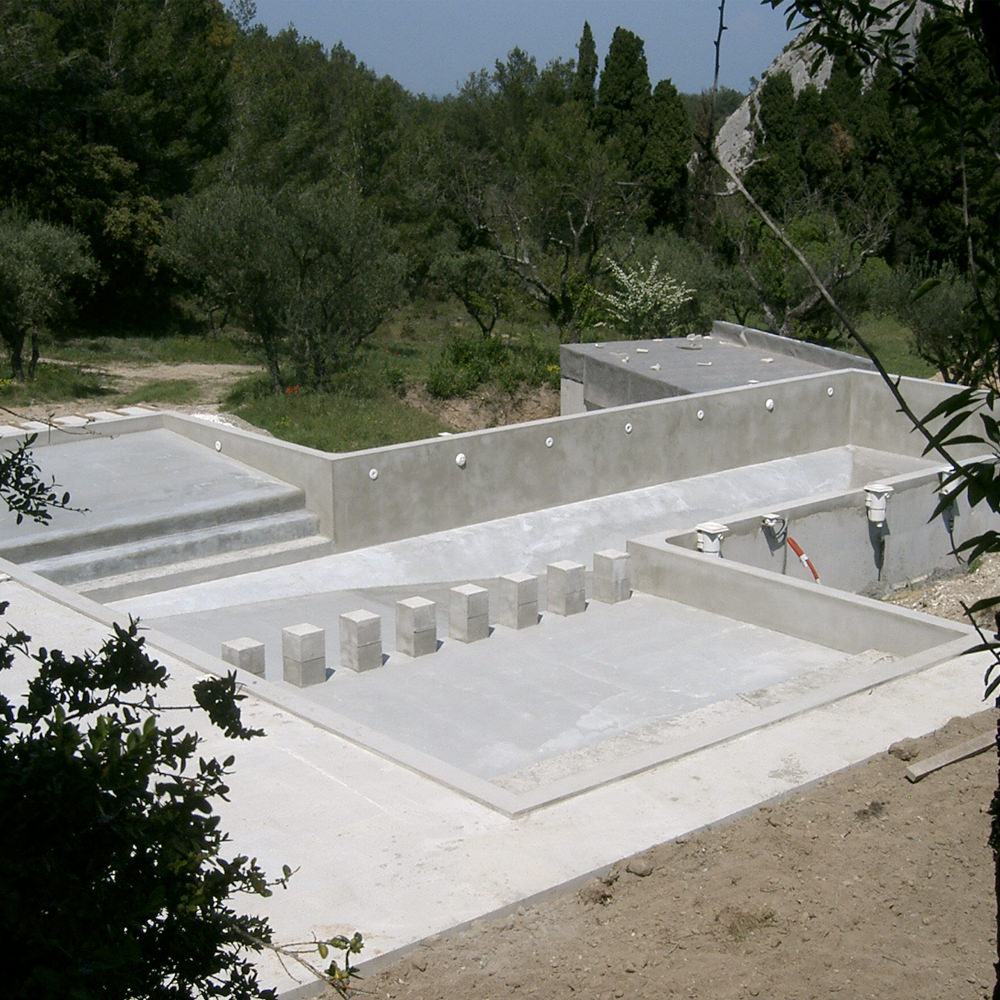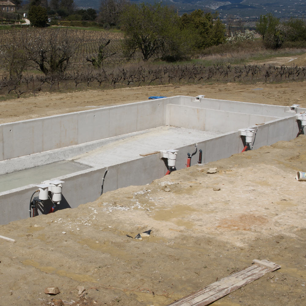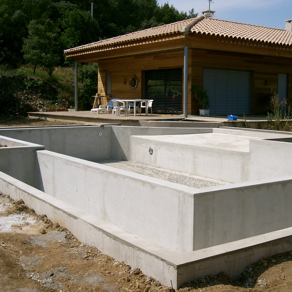Toutes nos piscines sont en béton armé coulé et vibré en continu dans des banches métalliques, ce qui crée une structure totalement monobloc à l’épreuve du temps et particulièrement adaptée à des terrains compliqués sur micro pieux ou autres.